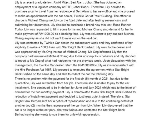 Therefore Lily decided to purchase a car to travel from her residence at Seri Alam to her new office and she proceed to make an appointment with the car dealer. 607 - 3812 400 Fax.